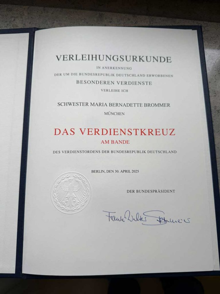 Wir als Mitschwestern von Sr. M. Bernadette gratulieren ihr von Herzen für die Würdigung ihres Einsatzes, die sie absolut verdient hat. Wir wünschen ihr weiterhin viel Kraft und Gottes Segen für ihr wertvolles Wirken.